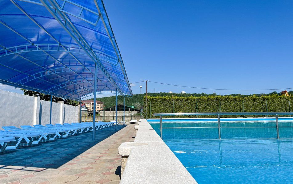 собственный, песчано-галечный, шезлонги, теневые навесы, душевые кабинки, туалетные комнаты, (5-7 минут пешком). |